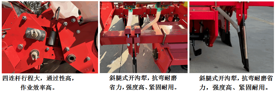 6、地輪采用單臂設計,有效避免纏繞、擁堵,各行傳動軸連成一體,統(tǒng)一驅(qū)動,傳動動力大,即使其中一側(cè)地輪偶然打滑也不影響正常播種:播種單體采用仿形設計,可隨地面上下浮動、可實現(xiàn)播深一致。