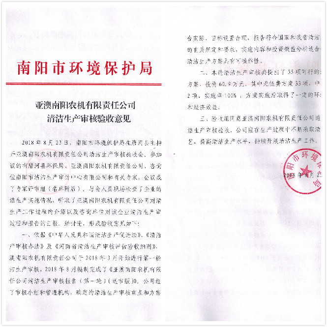 8月23日南陽市清潔生產(chǎn)審計中心攜權(quán)威認證專家對我公司清潔生產(chǎn)情況進行審核,會議上,專家對我公司清潔生產(chǎn)情況給予高度評價,一致認定亞澳農(nóng)機通過清潔生產(chǎn)審核,同時也為公司后續(xù)清潔生產(chǎn)提出一定要求及需改進的地方。我公司副總表示,接受專家們的建議,后續(xù)公司在清潔生產(chǎn)方面也將不斷改進。