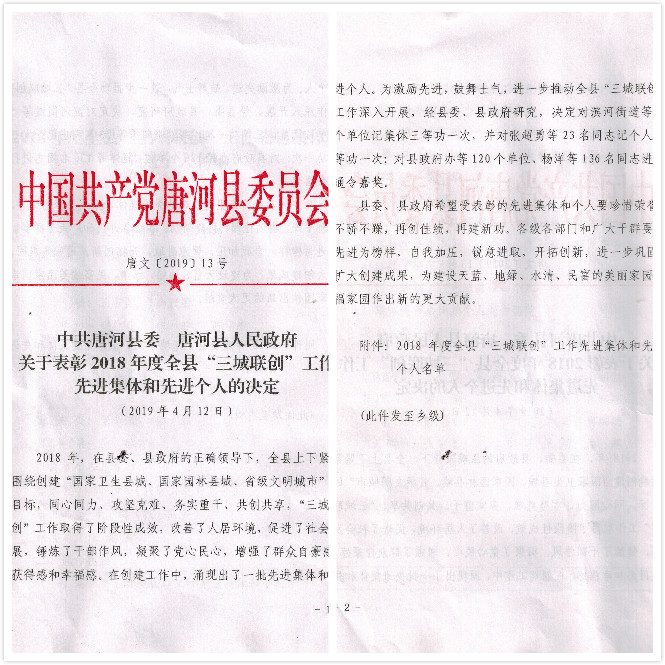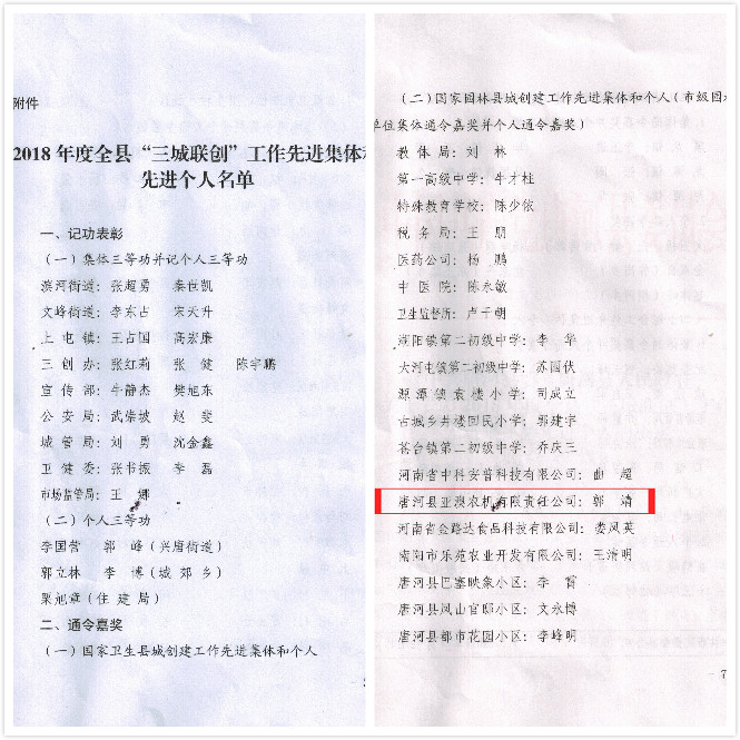 4月12日,唐河縣召開2018年度“三城聯(lián)創(chuàng)”總結(jié)大會。大會宣讀了表彰先進(jìn)集體及先進(jìn)個(gè)人的決定。亞澳農(nóng)機(jī)獲得2018年度國家園林縣城創(chuàng)建工作先進(jìn)集體。