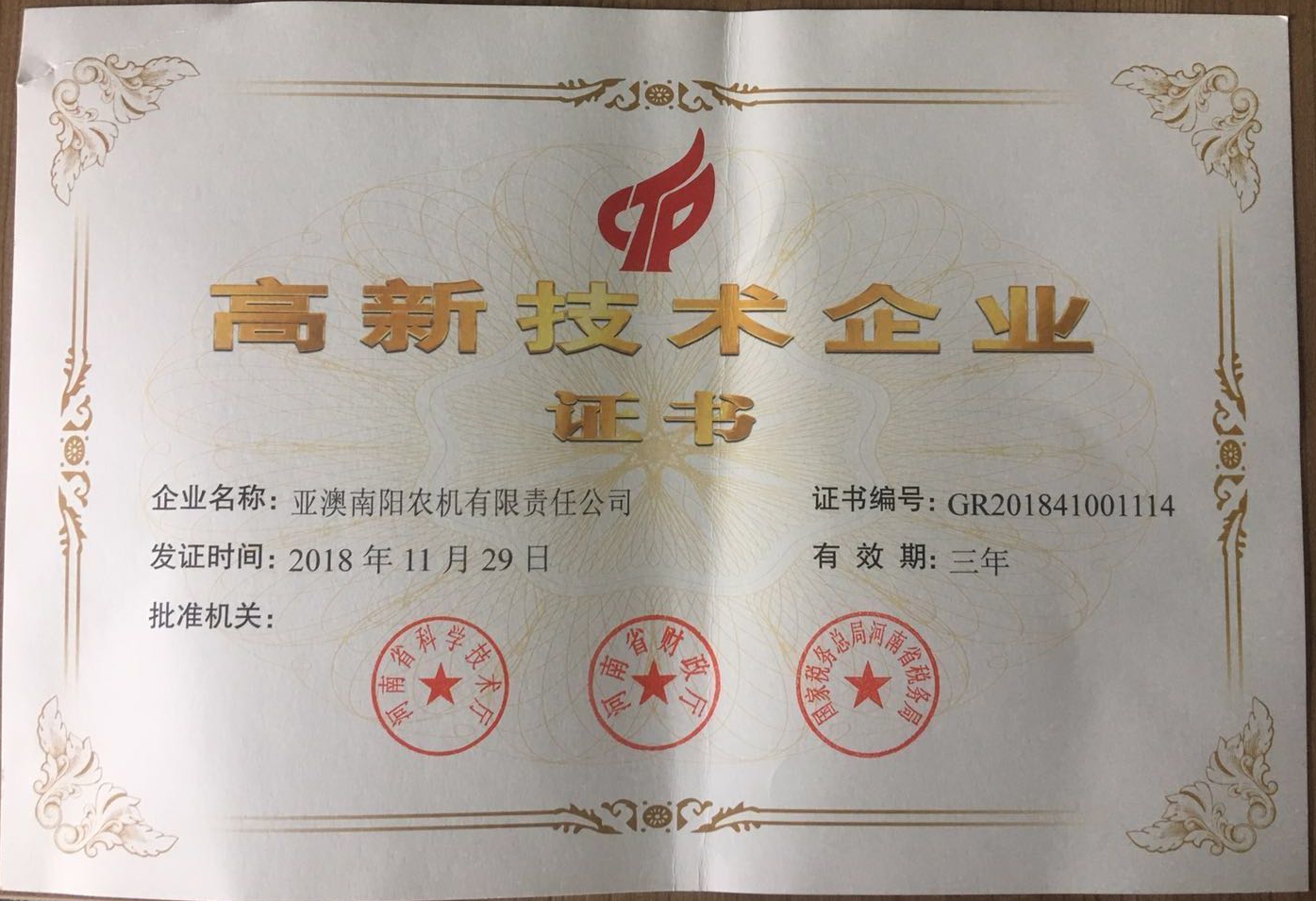 由河南省科學(xué)技術(shù)廳、河南省財(cái)政廳、國(guó)家稅務(wù)總局河南省稅務(wù)局,聯(lián)合頒發(fā)“高新技術(shù)企業(yè)”認(rèn)定證書,標(biāo)志著亞澳農(nóng)機(jī)在研發(fā)和創(chuàng)新方面的能力,得到了國(guó)家相關(guān)部門的肯定與認(rèn)可。