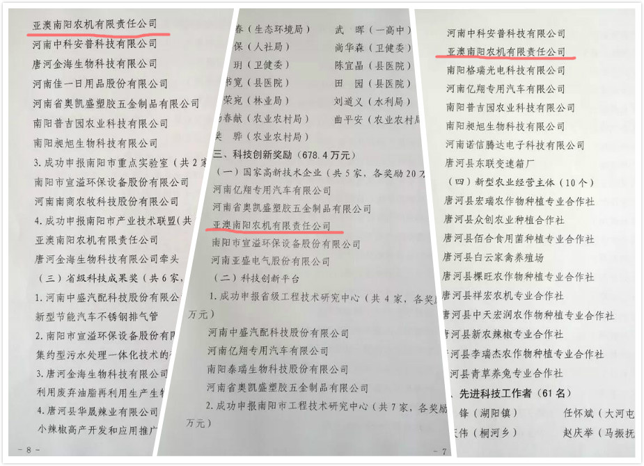亞澳農機共獲得政府獎勵35萬元。包括成功申報國家高新技術企業(yè)20萬元獎勵、市級工程技術研究中心5萬元獎勵、南陽市產業(yè)技術聯(lián)盟10萬元獎勵10萬元。