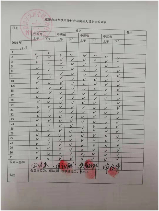 除此之外,我公司聯(lián)合村委會(huì)照顧一些特別貧困但有行動(dòng)能力的老人為村部垃圾清運(yùn)、水電維修、村落清潔等,并為此購(gòu)買(mǎi)公益崗位,每月定期給這些公益崗位發(fā)放工資500/個(gè)月,以確保他們的正常生活。這一決定從20185月至今已經(jīng)實(shí)行了一年半時(shí)間,累計(jì)發(fā)放公益崗位工資3.1萬(wàn)元。