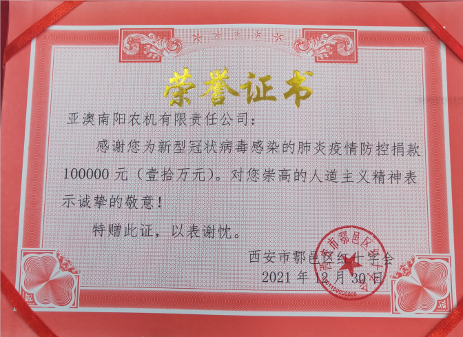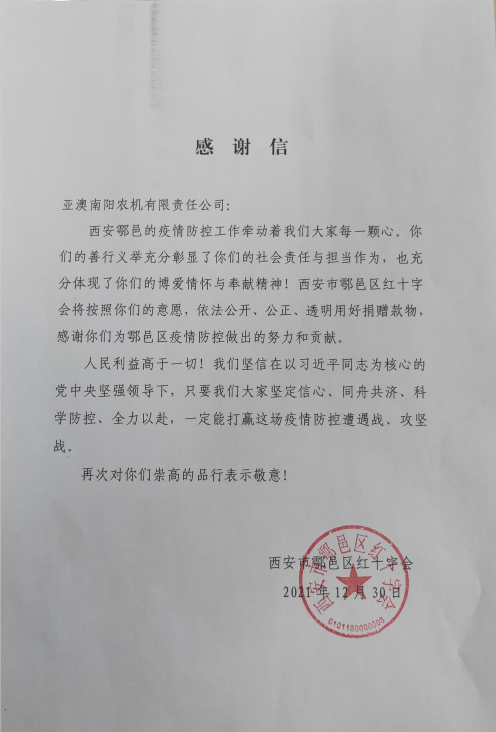 十二月份,一場突如其來的疫情打亂了西安人平靜的生活,面對日趨嚴峻的疫情態(tài)勢,亞澳農(nóng)機作為一家有社會責(zé)任感的企業(yè)積極奉獻自己力量,亞澳農(nóng)機南陽公司為鄠邑區(qū)紅十字會捐款100000元,亞澳農(nóng)機總公司為鄠邑區(qū)甘亭街道東韓村捐款40000元,亞澳農(nóng)機與社會各界人士并肩作戰(zhàn),為疫情防控工作貢獻自己的一份薄力。