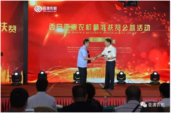 亞澳精準(zhǔn)扶貧公益活動(dòng)現(xiàn)場(chǎng),中國(guó)農(nóng)機(jī)化協(xié)會(huì)會(huì)長(zhǎng)劉憲到會(huì)致辭,并給予亞澳頒發(fā)證書。