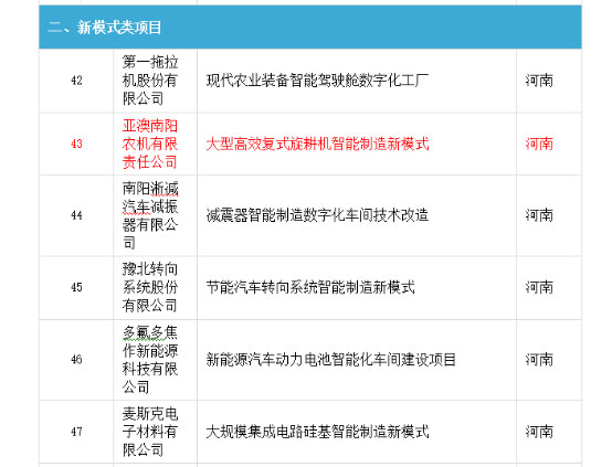 近日,亞澳農(nóng)機被國家工信部評為2017年智能制造綜合標準化與新模式應用示范企業(yè)。據(jù)了解,這次全國智能制造綜合標準化專項項目批準企業(yè)43 家,河南省內(nèi)2家,為機械工業(yè)第六設計研究院,洛陽軸研科技股份有限公司國有大型企業(yè);新模式應用立項51家,河南省僅批準6家,亞澳智能化制造新模式成為業(yè)界首家,并獲得國家專項資金補貼。