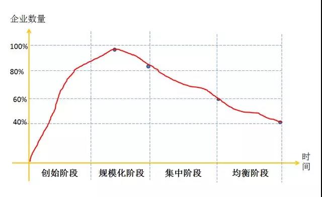 在一個行業(yè),從長期看,企業(yè)要存活下來就要有超出平均水平的成本控制能力。管理學家陳春花認為一個行業(yè)內(nèi)企業(yè)數(shù)量和時間軸之間的關系可以通過四個發(fā)展階段來說明:初創(chuàng)階段、規(guī)模化階段企業(yè)數(shù)量一直上升,規(guī)模化后期企業(yè)數(shù)量達到頂峰,開始有擠出效應,約20%企業(yè)出局,到集中階段又有20%企業(yè)出局,到均衡階段還要淘汰20%,最后的競爭就在剩下的40%企業(yè)之間展開。