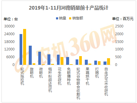 2019年1-11月,上榜河南用戶購機(jī)量前十的農(nóng)機(jī)產(chǎn)品如下圖所示,輪式拖拉機(jī)、旋耕機(jī)、微耕機(jī)等10種農(nóng)機(jī)合計(jì)購買力接近8.5萬臺(tái),占了河南農(nóng)機(jī)總銷量的約80%,對(duì)這10類農(nóng)機(jī)的購機(jī)支出達(dá)43.3億元。