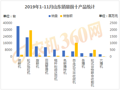 2019年1-11月,上榜山東用戶購機(jī)量前十的農(nóng)機(jī)產(chǎn)品如下圖所示,微耕機(jī)、輪式拖拉機(jī)、旋耕機(jī)等10種農(nóng)機(jī)合計(jì)購買力11.5萬多臺(tái),是山東農(nóng)機(jī)總銷量的86.54%,對(duì)這10類農(nóng)機(jī)的購機(jī)支出達(dá)38.55億元。