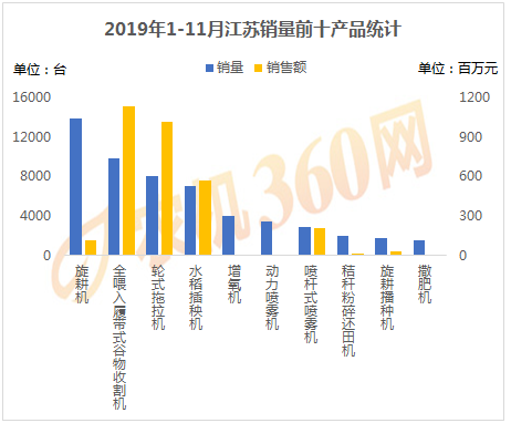 2019年1-11月,上榜江蘇用戶購機(jī)量前十的農(nóng)機(jī)產(chǎn)品如下圖所示,旋耕機(jī)、全喂入履帶式谷物收、輪式拖拉機(jī)等10種農(nóng)機(jī)合計(jì)購買力5.45萬臺(tái),是江蘇農(nóng)機(jī)銷量的85.35%,對(duì)這10類農(nóng)機(jī)的購機(jī)支出達(dá)31.02億元。