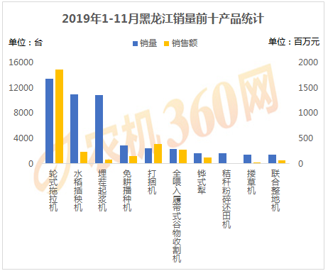 2019年1-11月,上榜黑龍江用戶購機(jī)量前十的農(nóng)機(jī)產(chǎn)品如下圖所示,輪式拖拉機(jī)、水稻插秧機(jī)、埋茬起漿機(jī)等10種農(nóng)機(jī)合計(jì)購買力4.9萬臺(tái),是黑龍江農(nóng)機(jī)銷量的93.09%,對(duì)這10類農(nóng)機(jī)的購機(jī)支出達(dá)32.23億元。